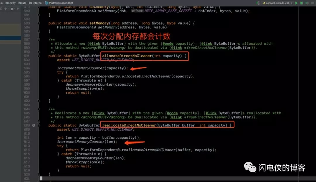 但是没办法,只能看着这堆讨厌的 OOM 日志发着呆,妄图答案能够蹦到眼前。一筹莫展之际,突然一道光在眼前一闪而过,在 OOM 下方的几行日志变得耀眼起来(为啥之前就没想认真查看日志?估计是被堆外内存泄露这几个词吓怕了吧==),这几行字是 ....PlatformDepedeng.incrementMemory()...。我去,原来,堆外内存是否够用,是 netty 这边自己统计的,那是不是可以找到统计代码,找到统计代码之后我们就可以看到 netty 里面的对外内存统计逻辑了?于是,接下来翻翻代码,找到这段逻辑,在 PlatformDepedent 这个类里面