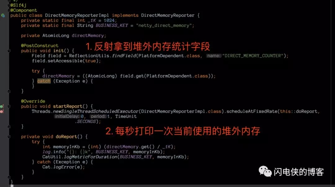 既然 cat 上关于堆外内存的监控没有任何异常(应该是没有统计准确,一直维持在 1M),而这边我们又确认堆外内存已快超过上限,并且已经知道 netty 底层是使用哪个字段来统计的,那么接下来要做的第一件事情,就是反射拿到这个字段,然后我们自己统计 netty 使用堆外内存的情况。