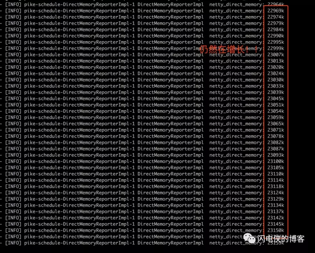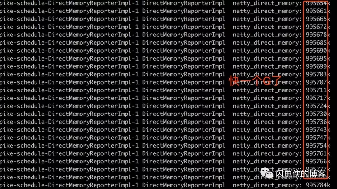 果然不出所料,内存一直在缓慢增长,一个周末的时间,堆外内存已经飙到快一个 G 了,这个时候,我竟然想到了一句成语:只要功夫深,铁杵磨成针!虽然堆外内存几个K几个K的在增长,但是只要一直持续下去,总有把内存打爆的时候(线上堆外内存上限设置的是2G)。