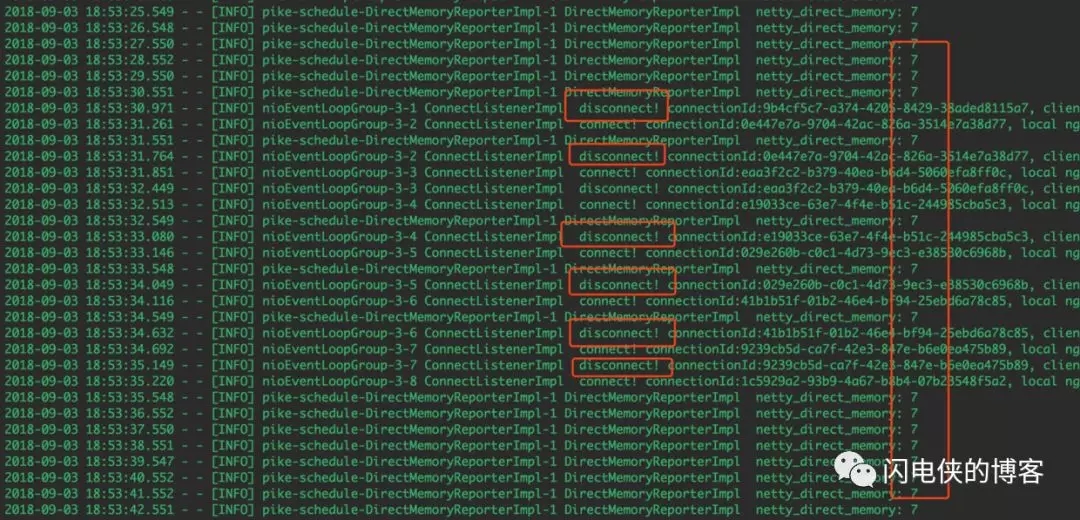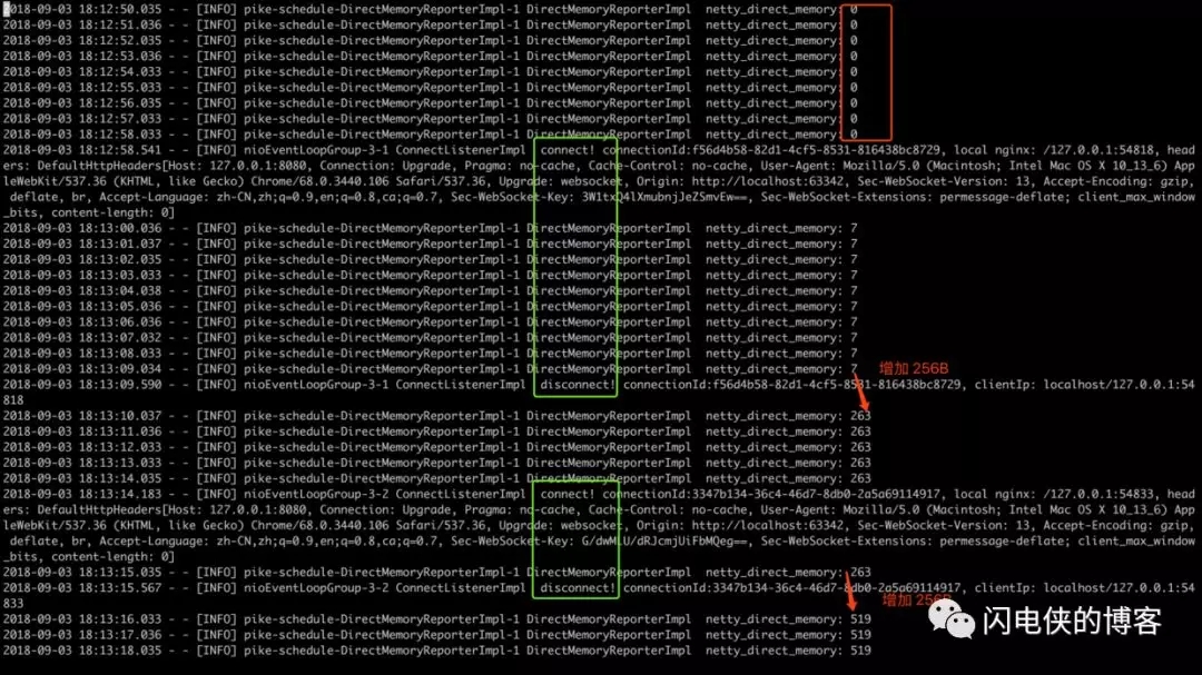 一切就绪之后,首先,我们来进行本地验证,服务起起来之后,我疯狂地建立连接,疯狂地断开连接,观察堆外内存的情况