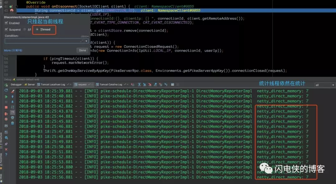 这里,在使用 idea debug的时候,要选择只挂起当前线程,这样我们在单步跟踪的时候,控制台仍然可以看到堆外内存统计线程在打印日志。