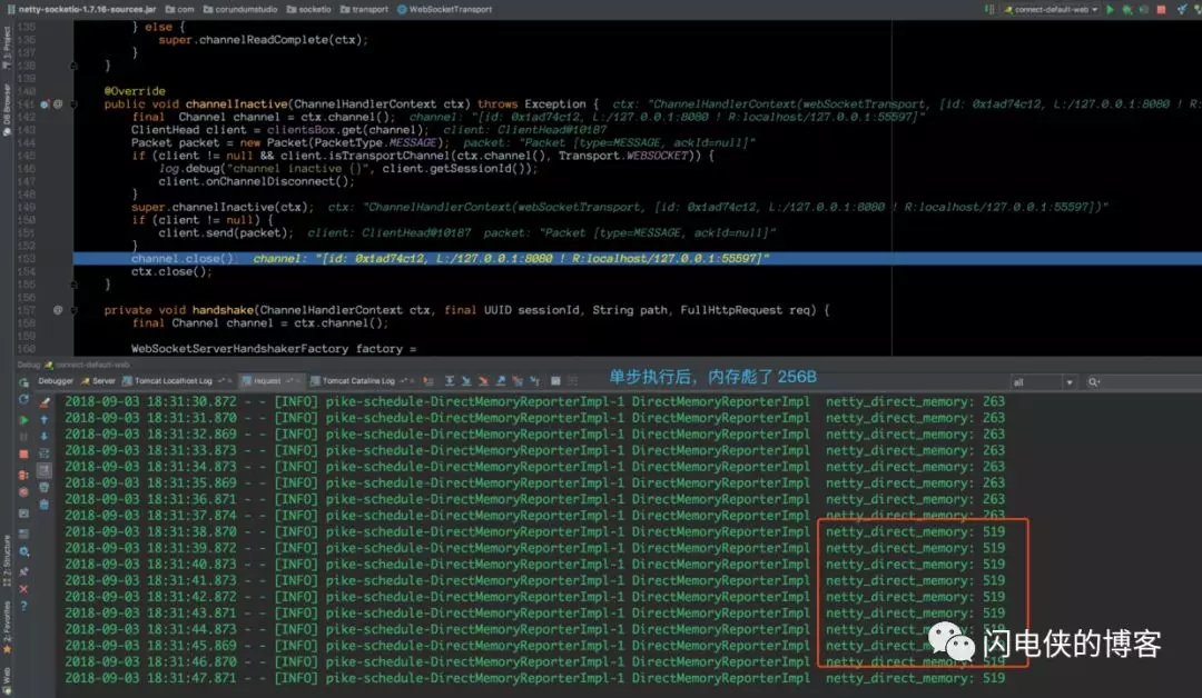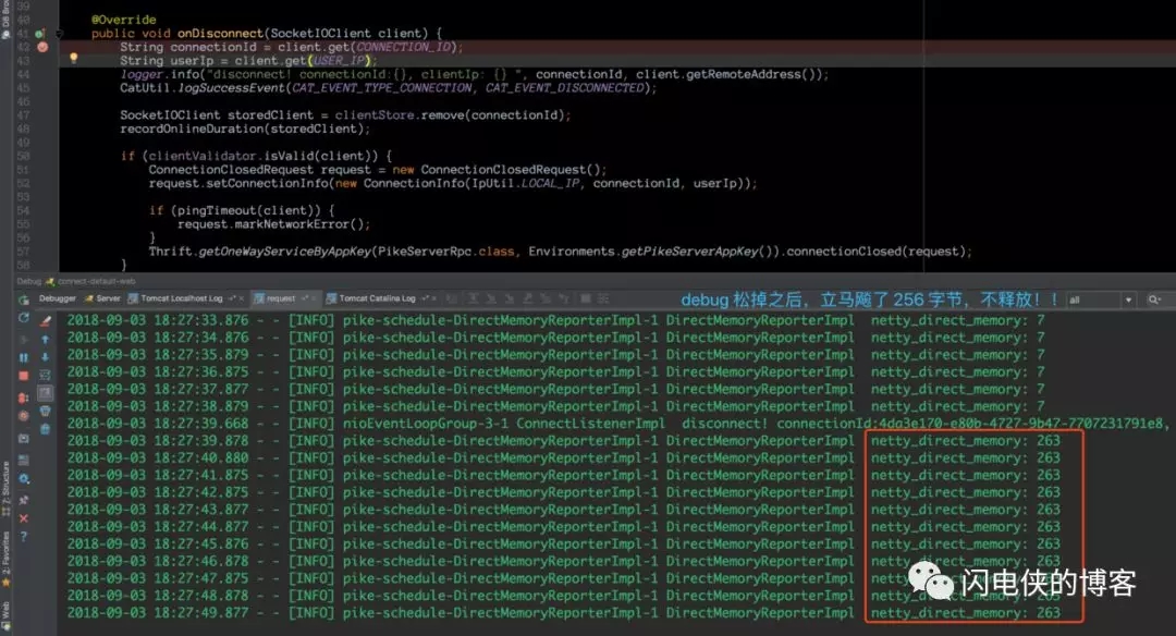 debug 松掉之后,内存立马飙升了!!这个时候我已经知道,这只臭虫飞不了多远了。在 debug 的时候,挂起的是当前线程,那么肯定是当前线程某个地方申请了堆外内存,然后没有释放,接下来,快马加鞭,深入源码。