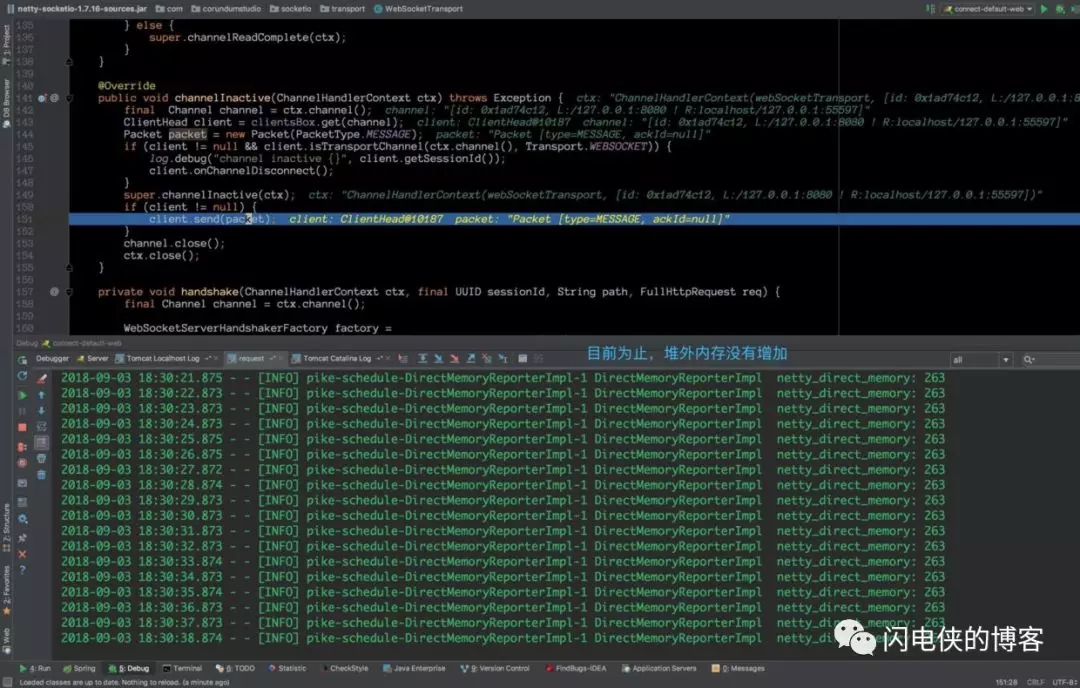 接下来,我将本地服务重启,开始完整的线下排查过程。将目光定位到 netty-socketio 这个框架的 disconnect 事件(客户端websocket连接关闭的时候回调用到这里),基本上可以确定是在 disconnect 事件前后申请的内存没有释放