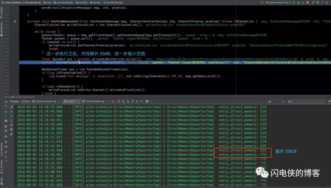 这段代码是把 packet 里面一个字段的值转换为一个 char,然而,当我使用 idea 预执行的时候,却抛出类一个愤怒的 NPE!!也就是说,框架申请到一段内存之后,在encoder的时候,自己GG了,自己给自己挖了个NPE的深坑,最后导致内存无法释放(最外层有堆外内存释放逻辑,现在无法执行到了),然后越攒越多,越攒越多,直到最后一根稻草,堆外内存就这样爆了,这里的源码有兴趣的读者可以自己去分析一下,限于篇幅原因,这里就不再分析了。