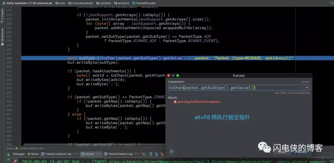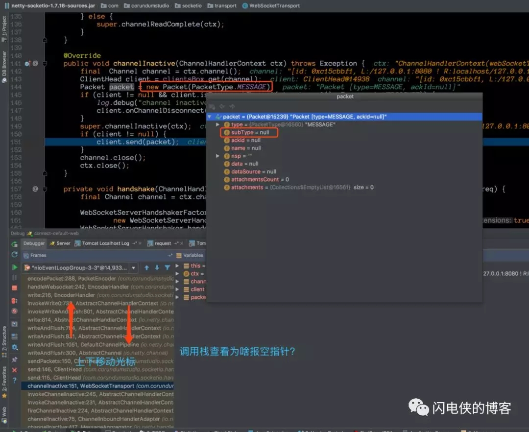 我们找到 idea 的 debugger 面板,眼睛盯着 packet 这个对象不放,然后上线移动光标,便光速定位到,原来,定义 packet 对象这个地方在我们前面的代码其实已经出现过,我们查看了一下 subType 这个字段,果然是null,接下来,解决bug很容易。