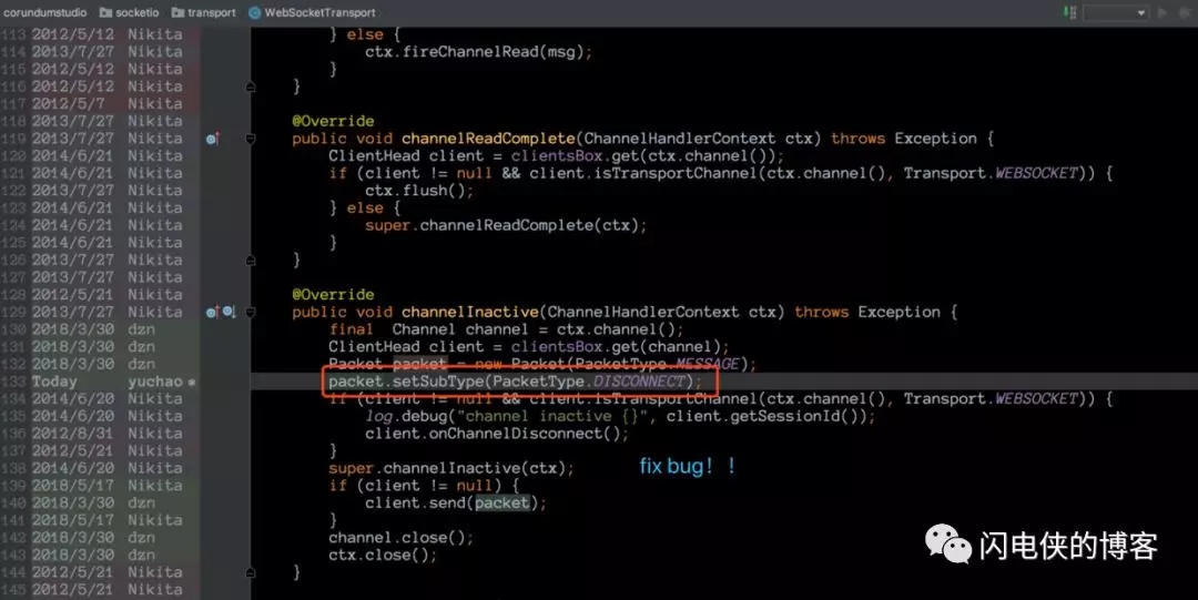 于是,bug的范围进一步缩小,我将本次程序跑完,释然后客户端再来一次连接,断点打在 client.send()这行, 然后关闭客户端连接,之后直接进入到这个方法,随后的过程有点长,因为与 netty 的时间传播机制有关,这里就省略了,最后,我跟到了如下代码, handleWebsocket
