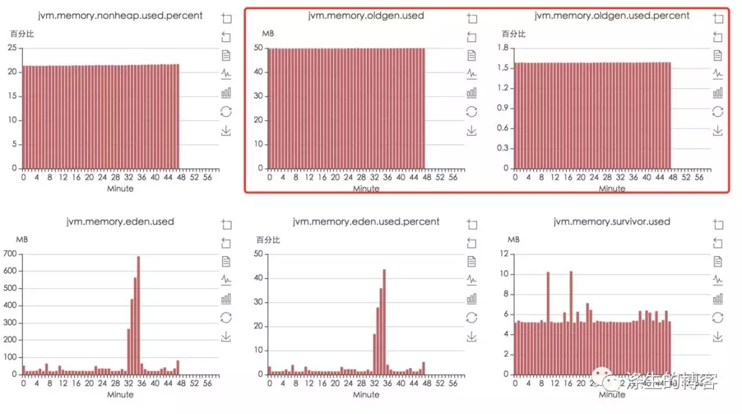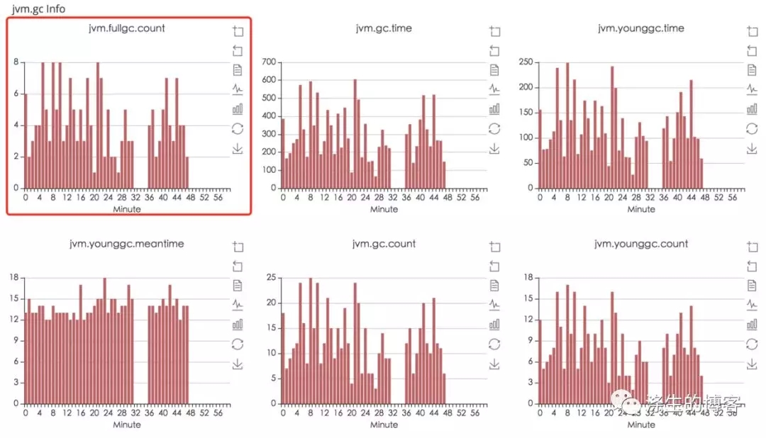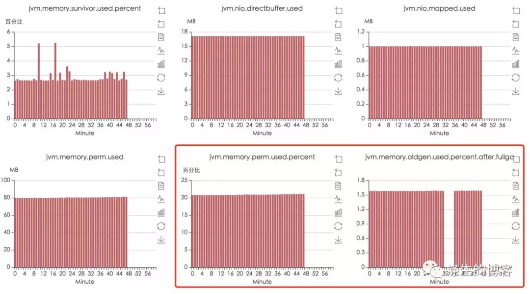 从监控图上看 Old Gen、Young Gen、Perm Gen,没什么问题,不会触发 Full GC,当然这里看各个 Gen 是否会触发 Full GC 需要结合 JVM 参数配置来看。