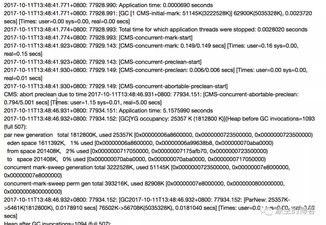 顺便也看了下 GC 日志,一直狂暴 CMS GC 日志,而且可以看到老年代使用空间也不大,细心可以发现,大量的 CMS GC 中夹杂着 Young、Perm 区的回收,所以其实是 Full GC。GC 日志如下: