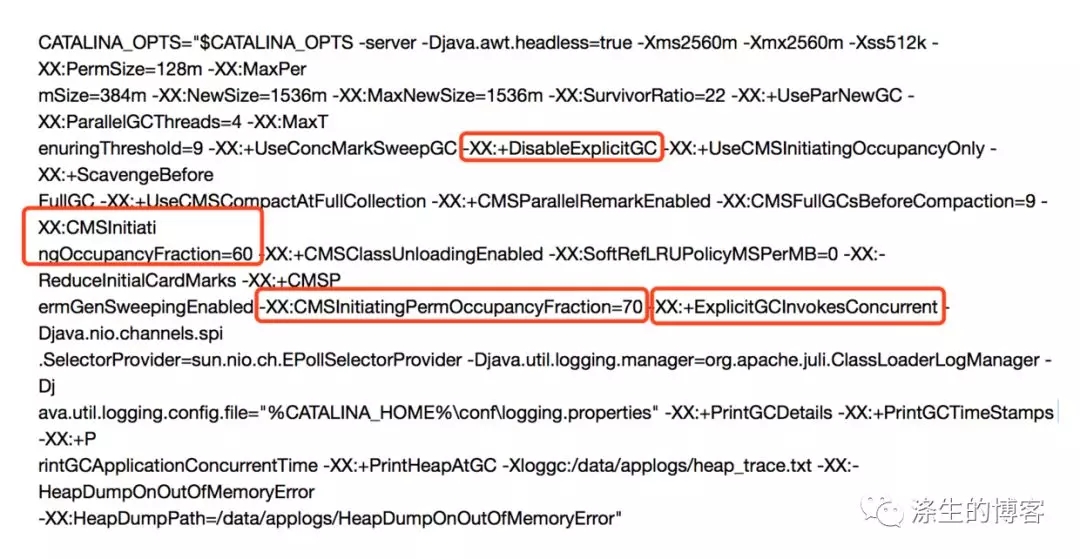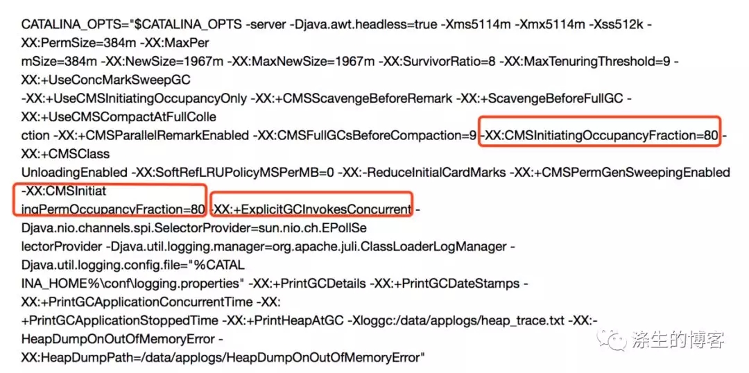 配置了 CMSClassUnloadingEnabled,且 Perm Gen 的使用达到一定的比率默认为 92%,这里看 CMSInitiatingPermOccupancyFraction=80%,而实际才使用 30%(看监控图表)不到,所以排除这种情况。