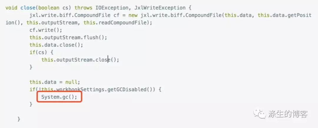 很明显,是由于 jxl 这个包中的 close 方法显示调用了 System.gc() 导致的问题。