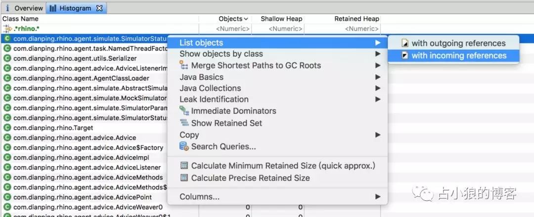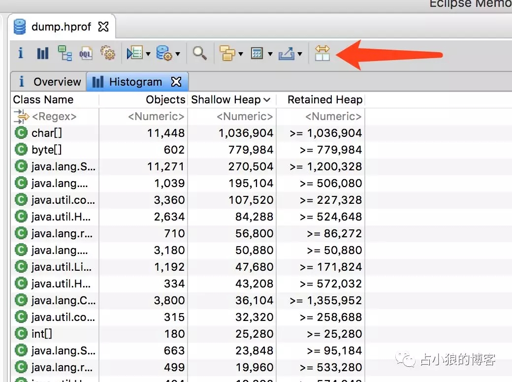 1、点开Histogram,可列出每一个类的实例数,支持正则表达式查找,也可以计算出该类所有对象的retained size。