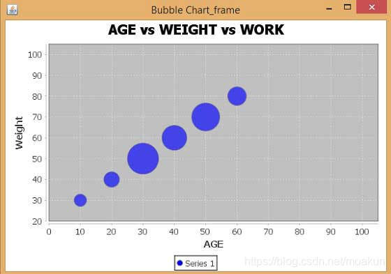 {public BubbleChart_AWT( String s ){super( s ); JPanel jpanel = createDemoPanel( ); jpanel.setPreferredSize(new Dimension( 560 , 370 ) ); setContentPane( jpanel ); }private static JFreeChart createChart( XYZDataset xyzdataset ){JFreeChart jfreechart = ChartFactory.createBubbleChart("AGE vs WEIGHT vs WORK", "Weight", "AGE", xyzdataset, PlotOrientation.HORIZONTAL, true, true, false);XYPlot xyplot = ( XYPlot )jfreechart.getPlot( ); xyplot.setForegroundAlpha( 0.65F ); XYItemRenderer xyitemrenderer = xyplot.getRenderer( );xyitemrenderer.setSeriesPaint( 0 , Color.blue ); NumberAxis numberaxis = ( NumberAxis )xyplot.getDomainAxis( ); numberaxis.setLowerMargin( 0.2 ); numberaxis.setUpperMargin( 0.5 ); NumberAxis numberaxis1 = ( NumberAxis )xyplot.getRangeAxis( ); numberaxis1.setLowerMargin( 0.8 ); numberaxis1.setUpperMargin( 0.9 );return jfreechart;}public static XYZDataset createDataset( ){DefaultXYZDataset defaultxyzdataset = new DefaultXYZDataset(); double ad[ ] = { 30 , 40 , 50 , 60 , 70 , 80 }; double ad1[ ] = { 10 , 20 , 30 , 40 , 50 , 60 }; double ad2[ ] = { 4 , 5 , 10 , 8 , 9 , 6 }; double ad3[][] = { ad , ad1 , ad2 }; defaultxyzdataset.addSeries( "Series 1" , ad3 );return defaultxyzdataset; }public static JPanel createDemoPanel( ){JFreeChart jfreechart = createChart( createDataset( ) ); ChartPanel chartpanel = new ChartPanel( jfreechart );chartpanel.setDomainZoomable( true ); chartpanel.setRangeZoomable( true );return chartpanel;}public static void main( String args[ ] ){BubbleChart_AWT bubblechart = new BubbleChart_AWT( "Bubble Chart_frame" ); bubblechart.pack( ); RefineryUtilities.centerFrameOnScreen( bubblechart ); bubblechart.setVisible( true ); }