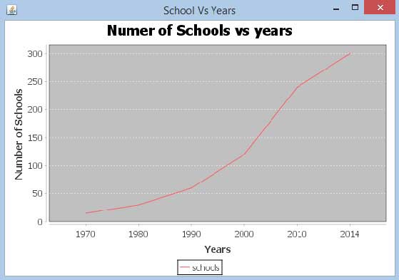 {public LineChart_AWT( String applicationTitle , String chartTitle ){super(applicationTitle);JFreeChart lineChart = ChartFactory.createLineChart(chartTitle,"Years","Number of Schools",createDataset(),PlotOrientation.VERTICAL,true,true,false);ChartPanel chartPanel = new ChartPanel( lineChart );chartPanel.setPreferredSize( new java.awt.Dimension( 560 , 367 ) );setContentPane( chartPanel );}private DefaultCategoryDataset createDataset( ){DefaultCategoryDataset dataset = new DefaultCategoryDataset( );dataset.addValue( 15 , "schools" , "1970" );dataset.addValue( 30 , "schools" , "1980" );dataset.addValue( 60 , "schools" ,  "1990" );dataset.addValue( 120 , "schools" , "2000" );dataset.addValue( 240 , "schools" , "2010" );dataset.addValue( 300 , "schools" , "2014" );return dataset;}public static void main( String[ ] args ) {LineChart_AWT chart = new LineChart_AWT("School Vs Years" ,"Numer of Schools vs years");chart.pack( );RefineryUtilities.centerFrameOnScreen( chart );chart.setVisible( true );}