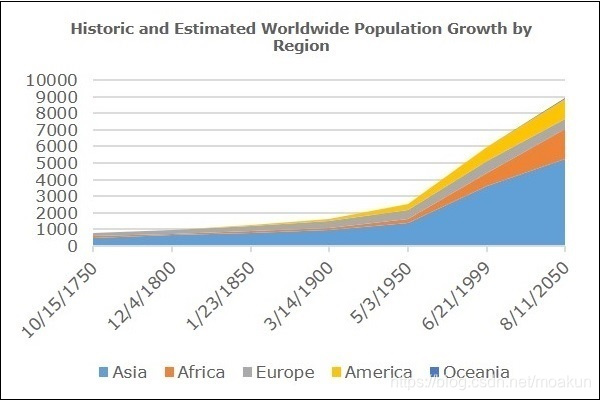 定义堆积面积图的X和Y轴并为其设置标签。在我们的例子中,X轴表示从1750年到2050年的不同年份。这些年有50年的主要蜱单位。而Y轴代表数百万人口的增长。