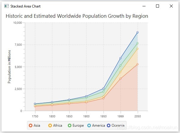 import javafx.scene.chart.XYChart; public class StackedAreaChartExample extends Application { @Override public void start(Stage stage) { //Defining the axes CategoryAxis xAxis = new CategoryAxis(); xAxis.setCategories(FXCollections.<String>observableArrayList( Arrays.asList("1750", "1800", "1850", "1900", "1950", "1999", "2050" ))); NumberAxis yAxis = new NumberAxis(0, 10000, 2500); yAxis.setLabel("Population in Millions"); //Creating the Area chart StackedAreaChart<String, Number> areaChart = new StackedAreaChart(xAxis, yAxis);areaChart.setTitle("Historic and Estimated Worldwide Population Growth by Region");//Prepare XYChart.Series objects by setting data XYChart.Series series1 = new XYChart.Series(); series1.setName("Asia"); series1.getData().add(new XYChart.Data("1750", 502)); series1.getData().add(new XYChart.Data("1800", 635)); series1.getData().add(new XYChart.Data("1850", 809)); series1.getData().add(new XYChart.Data("1900", 947)); series1.getData().add(new XYChart.Data("1950", 1402)); series1.getData().add(new XYChart.Data("1999", 3634)); series1.getData().add(new XYChart.Data("2050", 5268)); XYChart.Series series2 = new XYChart.Series(); series2.setName("Africa"); series2.getData().add(new XYChart.Data("1750", 106)); series2.getData().add(new XYChart.Data("1800", 107)); series2.getData().add(new XYChart.Data("1850", 111)); series2.getData().add(new XYChart.Data("1900", 133)); series2.getData().add(new XYChart.Data("1950", 221)); series2.getData().add(new XYChart.Data("1999", 767)); series2.getData().add(new XYChart.Data("2050", 1766)); XYChart.Series series3 = new XYChart.Series(); series3.setName("Europe"); series3.getData().add(new XYChart.Data("1750", 163)); series3.getData().add(new XYChart.Data("1800", 203)); series3.getData().add(new XYChart.Data("1850", 276)); series3.getData().add(new XYChart.Data("1900", 408)); series3.getData().add(new XYChart.Data("1950", 547)); series3.getData().add(new XYChart.Data("1999", 729)); series3.getData().add(new XYChart.Data("2050", 628)); XYChart.Series series4 = new XYChart.Series(); series4.setName("America"); series4.getData().add(new XYChart.Data("1750", 18)); series4.getData().add(new XYChart.Data("1800", 31)); series4.getData().add(new XYChart.Data("1850", 54)); series4.getData().add(new XYChart.Data("1900", 156)); series4.getData().add(new XYChart.Data("1950", 339)); series4.getData().add(new XYChart.Data("1999", 818)); series4.getData().add(new XYChart.Data("2050", 1201)); XYChart.Series series5 = new XYChart.Series(); series5.setName("Oceania"); series5.getData().add(new XYChart.Data("1750", 2)); series5.getData().add(new XYChart.Data("1800", 2)); series5.getData().add(new XYChart.Data("1850", 2)); series5.getData().add(new XYChart.Data("1900", 6)); series5.getData().add(new XYChart.Data("1950", 13)); series5.getData().add(new XYChart.Data("1999", 30)); series5.getData().add(new XYChart.Data("2050", 46)); //Setting the data to area chart areaChart.getData().addAll(series1, series2, series3, series4, series5); //Creating a Group object Group root = new Group(areaChart); //Creating a scene object Scene scene = new Scene(root, 600, 400); //Setting title to the Stage stage.setTitle("Stacked Area Chart"); //Adding scene to the stage stage.setScene(scene); //Displaying the contents of the stage stage.show(); } public static void main(String args[]){ launch(args); }