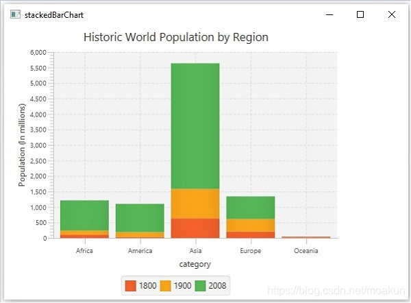 import javafx.scene.chart.XYChart; public class StackedBarChartExample extends Application { @Override public void start(Stage stage) {     //Defining the axes               CategoryAxis xAxis = new CategoryAxis();    xAxis.setCategories(FXCollections.<String>observableArrayList(Arrays.asList("Africa", "America", "Asia", "Europe", "Oceania"))); xAxis.setLabel("category");NumberAxis yAxis = new NumberAxis(); yAxis.setLabel("Population (In millions)");    //Creating the Bar chart StackedBarChart<String, Number> stackedBarChart = new StackedBarChart<>(xAxis, yAxis);         stackedBarChart.setTitle("Historic World Population by Region"); //Prepare XYChart.Series objects by setting data XYChart.Series<String, Number> series1 = new XYChart.Series<>();  series1.setName("1800"); series1.getData().add(new XYChart.Data<>("Africa", 107)); series1.getData().add(new XYChart.Data<>("America", 31));  series1.getData().add(new XYChart.Data<>("Asia", 635)); series1.getData().add(new XYChart.Data<>("Europe", 203)); series1.getData().add(new XYChart.Data<>("Oceania", 2)); XYChart.Series<String, Number> series2 = new XYChart.Series<>(); series2.setName("1900"); series2.getData().add(new XYChart.Data<>("Africa", 133)); series2.getData().add(new XYChart.Data<>("America", 156)); series2.getData().add(new XYChart.Data<>("Asia", 947)); series2.getData().add(new XYChart.Data<>("Europe", 408)); series1.getData().add(new XYChart.Data<>("Oceania", 6));  XYChart.Series<String, Number> series3 = new XYChart.Series<>(); series3.setName("2008"); series3.getData().add(new XYChart.Data<>("Africa", 973)); series3.getData().add(new XYChart.Data<>("America", 914)); series3.getData().add(new XYChart.Data<>("Asia", 4054)); series3.getData().add(new XYChart.Data<>("Europe", 732)); series1.getData().add(new XYChart.Data<>("Oceania", 34)); //Setting the data to bar chartstackedBarChart.getData().addAll(series1, series2, series3); //Creating a Group object  Group root = new Group(stackedBarChart); //Creating a scene object Scene scene = new Scene(root, 600, 400);  //Setting title to the Stage stage.setTitle("stackedBarChart"); //Adding scene to the stage stage.setScene(scene); //Displaying the contents of the stage stage.show();         } public static void main(String args[]){ launch(args); }