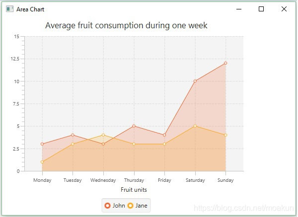 import javafx.scene.chart.XYChart; public class AreaChartExample extends Application { @Override public void start(Stage stage) { //Defining the X axis CategoryAxis xAxis = new CategoryAxis(); //defining the y Axis NumberAxis yAxis = new NumberAxis(0, 15, 2.5); yAxis.setLabel("Fruit units"); //Creating the Area chart AreaChart<String, Number> areaChart = new AreaChart(xAxis, yAxis);areaChart.setTitle("Average fruit consumption during one week"); //Prepare XYChart.Series objects by setting data XYChart.Series series1 = new XYChart.Series(); series1.setName("John"); series1.getData().add(new XYChart.Data("Monday", 3)); series1.getData().add(new XYChart.Data("Tuesday", 4)); series1.getData().add(new XYChart.Data("Wednesday", 3)); series1.getData().add(new XYChart.Data("Thursday", 5)); series1.getData().add(new XYChart.Data("Friday", 4));series1.getData().add(new XYChart.Data("Saturday", 10)); series1.getData().add(new XYChart.Data("Sunday", 12)); XYChart.Series series2 = new XYChart.Series(); series2.setName("Jane"); series2.getData().add(new XYChart.Data("Monday", 1)); series2.getData().add(new XYChart.Data("Tuesday", 3)); series2.getData().add(new XYChart.Data("Wednesday", 4)); series2.getData().add(new XYChart.Data("Thursday", 3)); series2.getData().add(new XYChart.Data("Friday", 3)); series2.getData().add(new XYChart.Data("Saturday", 5)); series2.getData().add(new XYChart.Data("Sunday", 4)); //Setting the XYChart.Series objects to area chart areaChart.getData().addAll(series1,series2); //Creating a Group object Group root = new Group(areaChart); //Creating a scene object Scene scene = new Scene(root, 600, 400); //Setting title to the Stage stage.setTitle("Area Chart"); //Adding scene to the stage stage.setScene(scene); //Displaying the contents of the stage stage.show(); } public static void main(String args[]){ launch(args)}
