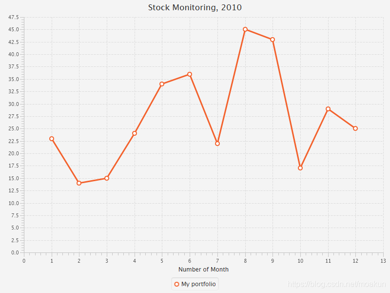 import javax.imageio.ImageIO;public class LineChartTest {public static void export() {final NumberAxis xAxis = new NumberAxis();final NumberAxis yAxis = new NumberAxis();xAxis.setLabel("Number of Month");//creating the chartfinal LineChart<Number, Number> lineChart= new LineChart<>(xAxis, yAxis);lineChart.setTitle("Stock Monitoring, 2010");//defining a seriesXYChart.Series series = new XYChart.Series();series.setName("My portfolio");//populating the series with dataseries.getData().add(new XYChart.Data(1, 23));series.getData().add(new XYChart.Data(2, 14));series.getData().add(new XYChart.Data(3, 15));series.getData().add(new XYChart.Data(4, 24));series.getData().add(new XYChart.Data(5, 34));series.getData().add(new XYChart.Data(6, 36));series.getData().add(new XYChart.Data(7, 22));series.getData().add(new XYChart.Data(8, 45));series.getData().add(new XYChart.Data(9, 43));series.getData().add(new XYChart.Data(10, 17));series.getData().add(new XYChart.Data(11, 29));series.getData().add(new XYChart.Data(12, 25));lineChart.getData().add(series);//防止坐标刻度不显示lineChart.setAnimated(false);//必须添加到场景,否则图表不绘制Scene scene = new Scene(lineChart, 800, 600);WritableImage writableImage = new WritableImage(800, (int) 600);lineChart.snapshot(new SnapshotParameters(), writableImage);File fileA = new File("./chart.png");try {ImageIO.write(SwingFXUtils.fromFXImage(writableImage, null), "png", fileA);} catch (Exception s) {s.printStackTrace();}}public static void main(String[] args) throws InterruptedException {PlatformImpl.startup(() -> {export();System.err.println("finish");System.exit(0);//退出程序});}