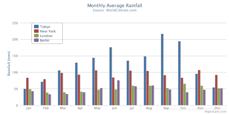 public ChartOptions createColumnBasic () {// http://highcharts.com/demo/column-basicChartOptions chartOptions = factory.createChartOptions ();chartOptions.getChart ().setDefaultSeriesType (SeriesType.column).setWidth (800).setHeight (400).setMarginLeft (70).setMarginTop (80);// titleschartOptions.getTitle ().setText ("Monthly Average Rainfall");chartOptions.getSubtitle ().setText ("Source: WorldClimate.com");// xAxischartOptions.getXAxis ().getCategories ().pushString ("Jan").pushString ("Feb").pushString ("Mar").pushString ("Apr").pushString ("May").pushString ("Jun").pushString ("Jul").pushString ("Aug").pushString ("Sep").pushString ("Oct").pushString ("Nov").pushString ("Dec");// yAxischartOptions.getYAxis ().setMin (0).getTitle ().setText ("Rainfall (mm)");// LegendchartOptions.getLegend ().setLayout ("vertical").setAlign ("left").setVerticalAlign ("top").setX (100).setY (70);// PlotOptionschartOptions.getPlotOptions ().getColumn ().setBorderWidth (0);// Several seriesaddSeries (chartOptions, "Tokyo", new double[] { 49.9, 71.5, 106.4, 129.2,144.0, 176.0, 135.6, 148.5, 216.4, 194.1, 95.6, 54.4 });addSeries (chartOptions, "New York", new double[] { 83.6, 78.8, 98.5, 93.4,106.0, 84.5, 105.0, 104.3, 91.2, 83.5, 106.6, 92.3 });addSeries (chartOptions, "London", new double[] { 48.9, 38.8, 39.3, 41.4,47.0, 48.3, 59.0, 59.6, 52.4, 65.2, 59.3, 51.2 });addSeries (chartOptions, "Berlin", new double[] { 42.4, 33.2, 34.5, 39.7,52.6, 75.5, 57.4, 60.4, 47.6, 39.1, 46.8, 51.1 });return chartOptions;}
