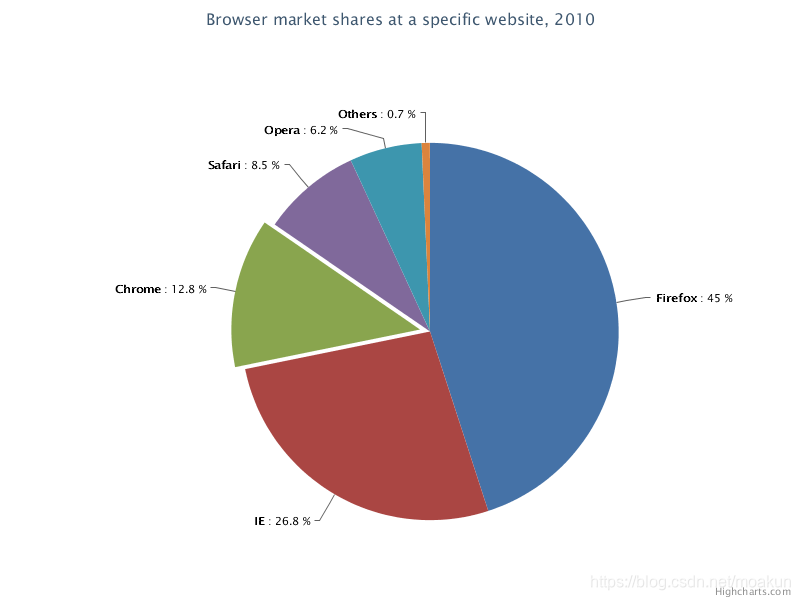 public ChartOptions createPieChart () {// http://highcharts.com/demo/pie-basicChartOptions chartOptions = factory.createChartOptions ();chartOptions.getChart ().setWidth (800).setHeight (600).setMarginLeft (70).setMarginTop (80);// titlechartOptions.getTitle ().setText ("Browser market shares at a specific website, 2010");// plotOptionschartOptions.getPlotOptions ().getPie ().setAllowPointSelect (true).getDataLabels ().setEnabled (true).setColor ("#000000").setFormatter ("function() {return '<b>'+ this.point.name +'</b>: '+ this.y +' %';}");Series newSeries = factory.createSeries ().setName ("Browser share").setType ("pie");chartOptions.getSeries ().pushElement (newSeries);newSeries.getData ().pushElement (factory.createPoint ().setName ("Firefox").setY (45)).pushElement (factory.createPoint ().setName ("IE").setY (26.8)).pushElement (factory.createPoint ().setName ("Chrome").setY (12.8).setSliced (true).setSelected (true)).pushElement (factory.createPoint ().setName ("Safari").setY (8.5)).pushElement (factory.createPoint ().setName ("Opera").setY (6.2)).pushElement (factory.createPoint ().setName ("Others").setY (0.7));return chartOptions;}