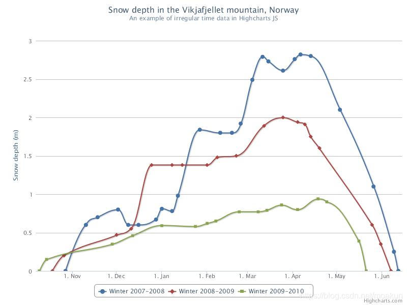 public ChartOptions createTimeDataWithIrregularIntervals () {// http://highcharts.com/demo/spline-irregular-timeChartOptions chartOptions = factory.createChartOptions ();chartOptions.getChart ().setWidth (800).setHeight (600).setDefaultSeriesType (SeriesType.spline).setMarginLeft (70).setMarginTop (80);// titleschartOptions.getTitle ().setText ("Snow depth in the Vikjafjellet mountain, Norway");chartOptions.getSubtitle ().setText ("An example of irregular time data in Highcharts JS");// axischartOptions.getXAxis ().setType ("datetime").getDateTimeLabelFormats ().set (TimeUnit.month, "%e. %b").set (TimeUnit.year, "%b");chartOptions.getYAxis ().setMin (0).getTitle ().setText ("Snow depth (m)");// plotOptionschartOptions.getPlotOptions ().getPie ().setAllowPointSelect (true).getDataLabels ().setEnabled (true).setColor ("#000000").setFormatter ("function() {return '<b>'+ this.point.name +'</b>: '+ this.y +' %';}");Series newSeries = factory.createSeries ().setName ("Winter 2007-2008");chartOptions.getSeries ().pushElement (newSeries);newSeries.getData ().pushElement (factory.createPoint ().setX (getDateUTC (1970, 9, 27)).setY (0)).pushElement (factory.createPoint ().setX (getDateUTC (1970, 10, 10)).setY (0.6)).pushElement (factory.createPoint ().setX (getDateUTC (1970, 10, 18)).setY (0.7)).pushElement (factory.createPoint ().setX (getDateUTC (1970, 11, 2)).setY (0.8)).pushElement (factory.createPoint ().setX (getDateUTC (1970, 11, 9)).setY (0.6)).pushElement (factory.createPoint ().setX (getDateUTC (1970, 11, 16)).setY (0.6)).pushElement (factory.createPoint ().setX (getDateUTC (1970, 11, 28)).setY (0.67)).pushElement (factory.createPoint ().setX (getDateUTC (1971, 0, 1)).setY (0.81)).pushElement (factory.createPoint ().setX (getDateUTC (1971, 0, 8)).setY (0.78)).pushElement (factory.createPoint ().setX (getDateUTC (1971, 0, 12)).setY (0.98)).pushElement (factory.createPoint ().setX (getDateUTC (1971, 0, 27)).setY (1.84)).pushElement (factory.createPoint ().setX (getDateUTC (1971, 1, 10)).setY (1.8)).pushElement (factory.createPoint ().setX (getDateUTC (1971, 1, 18)).setY (1.8)).pushElement (factory.createPoint ().setX (getDateUTC (1971, 1, 24)).setY (1.92)).pushElement (factory.createPoint ().setX (getDateUTC (1971, 2, 4)).setY (2.49)).pushElement (factory.createPoint ().setX (getDateUTC (1971, 2, 11)).setY (2.79)).pushElement (factory.createPoint ().setX (getDateUTC (1971, 2, 15)).setY (2.73)).pushElement (factory.createPoint ().setX (getDateUTC (1971, 2, 25)).setY (2.61)).pushElement (factory.createPoint ().setX (getDateUTC (1971, 3, 2)).setY (2.76)).pushElement (factory.createPoint ().setX (getDateUTC (1971, 3, 6)).setY (2.82)).pushElement (factory.createPoint ().setX (getDateUTC (1971, 3, 13)).setY (2.8)).pushElement (factory.createPoint ().setX (getDateUTC (1971, 4, 3)).setY (2.1)).pushElement (factory.createPoint ().setX (getDateUTC (1971, 4, 26)).setY (1.1)).pushElement (factory.createPoint ().setX (getDateUTC (1971, 5, 9)).setY (0.25)).pushElement (factory.createPoint ().setX (getDateUTC (1971, 5, 12)).setY (0));newSeries = factory.createSeries ().setName ("Winter 2008-2009");chartOptions.getSeries ().pushElement (newSeries);newSeries.getData ().pushElement (factory.createPoint ().setX (getDateUTC (1970, 9, 18)).setY (0)).pushElement (factory.createPoint ().setX (getDateUTC (1970, 9, 26)).setY (0.2)).pushElement (factory.createPoint ().setX (getDateUTC (1970, 11, 1)).setY (0.47)).pushElement (factory.createPoint ().setX (getDateUTC (1970, 11, 11)).setY (0.55)).pushElement (factory.createPoint ().setX (getDateUTC (1970, 11, 25)).setY (1.38)).pushElement (factory.createPoint ().setX (getDateUTC (1971, 0, 8)).setY (1.38)).pushElement (factory.createPoint ().setX (getDateUTC (1971, 0, 15)).setY (1.38)).pushElement (factory.createPoint ().setX (getDateUTC (1971, 1, 1)).setY (1.38)).pushElement (factory.createPoint ().setX (getDateUTC (1971, 1, 8)).setY (1.48)).pushElement (factory.createPoint ().setX (getDateUTC (1971, 1, 21)).setY (1.5)).pushElement (factory.createPoint ().setX (getDateUTC (1971, 2, 12)).setY (1.89)).pushElement (factory.createPoint ().setX (getDateUTC (1971, 2, 25)).setY (2.0)).pushElement (factory.createPoint ().setX (getDateUTC (1971, 3, 4)).setY (1.94)).pushElement (factory.createPoint ().setX (getDateUTC (1971, 3, 9)).setY (1.91)).pushElement (factory.createPoint ().setX (getDateUTC (1971, 3, 13)).setY (1.75)).pushElement (factory.createPoint ().setX (getDateUTC (1971, 3, 19)).setY (1.6)).pushElement (factory.createPoint ().setX (getDateUTC (1971, 4, 25)).setY (0.6)).pushElement (factory.createPoint ().setX (getDateUTC (1971, 4, 31)).setY (0.35)).pushElement (factory.createPoint ().setX (getDateUTC (1971, 5, 7)).setY (0));newSeries = factory.createSeries ().setName ("Winter 2009-2010");chartOptions.getSeries ().pushElement (newSeries);newSeries.getData ().pushElement (factory.createPoint ().setX (getDateUTC (1970, 9, 9)).setY (0)).pushElement (factory.createPoint ().setX (getDateUTC (1970, 9, 14)).setY (0.15)).pushElement (factory.createPoint ().setX (getDateUTC (1970, 10, 28)).setY (0.35)).pushElement (factory.createPoint ().setX (getDateUTC (1970, 11, 12)).setY (0.46)).pushElement (factory.createPoint ().setX (getDateUTC (1971, 0, 1)).setY (0.59)).pushElement (factory.createPoint ().setX (getDateUTC (1971, 0, 24)).setY (0.58)).pushElement (factory.createPoint ().setX (getDateUTC (1971, 1, 1)).setY (0.62)).pushElement (factory.createPoint ().setX (getDateUTC (1971, 1, 7)).setY (0.65)).pushElement (factory.createPoint ().setX (getDateUTC (1971, 1, 23)).setY (0.77)).pushElement (factory.createPoint ().setX (getDateUTC (1971, 2, 8)).setY (0.77)).pushElement (factory.createPoint ().setX (getDateUTC (1971, 2, 14)).setY (0.79)).pushElement (factory.createPoint ().setX (getDateUTC (1971, 2, 24)).setY (0.86)).pushElement (factory.createPoint ().setX (getDateUTC (1971, 3, 4)).setY (0.8)).pushElement (factory.createPoint ().setX (getDateUTC (1971, 3, 18)).setY (0.94)).pushE