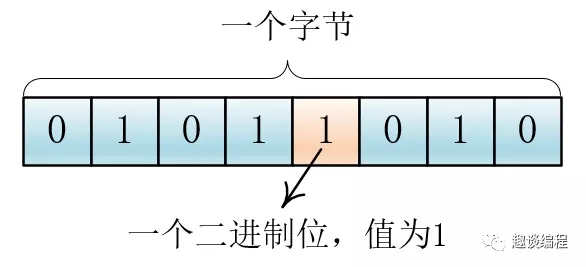 我们知道,在计算机中每八个二进制位组成了一个字节(Byte),计算机存储的最小单位就是字节,字节如下图所示 :