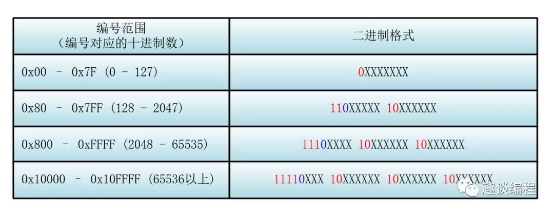 下面我们来具体看看具体的Unicode编号范围与对应的UTF-8二进制格式