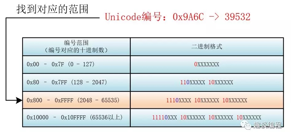 首先找到该Unicode编号所在的编号范围,进而可以找到与之对应的二进制格式,然后将该Unicode编号转化为二进制数(去掉高位的0),最后将该二进制数从右向左依次填入二进制格式的X中,如果还有X未填,则设为0 。