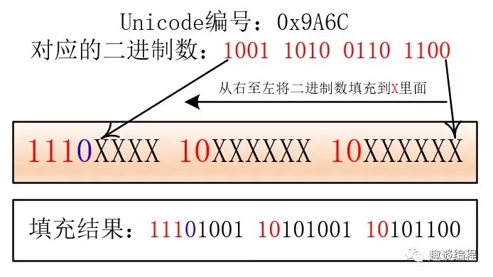 比如:“马”的Unicode编号是:0x9A6C,整数编号是39532,对应第三个范围(2048 - 65535),其格式为:1110XXXX 10XXXXXX 10XXXXXX,39532 对应的二进制是 1001 1010 0110 1100,将二进制填入进入就为: