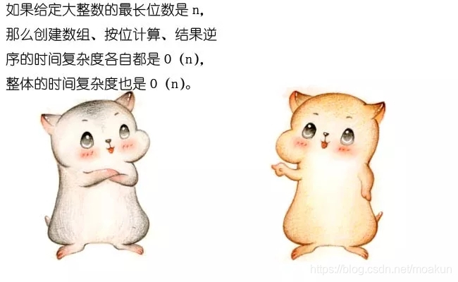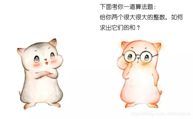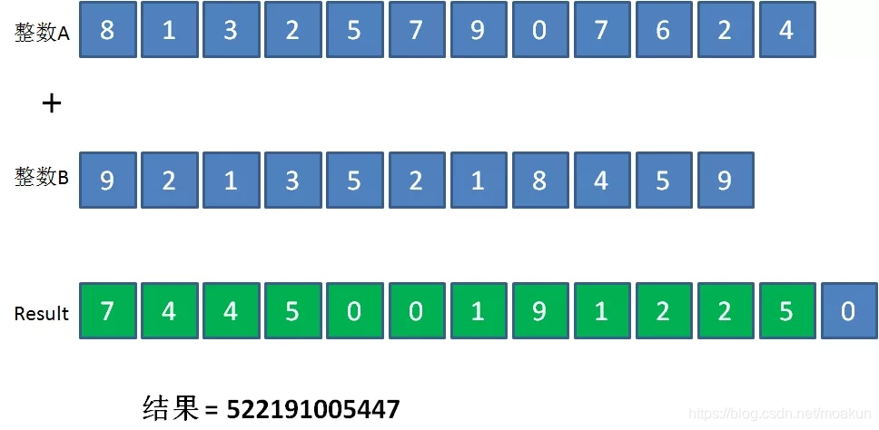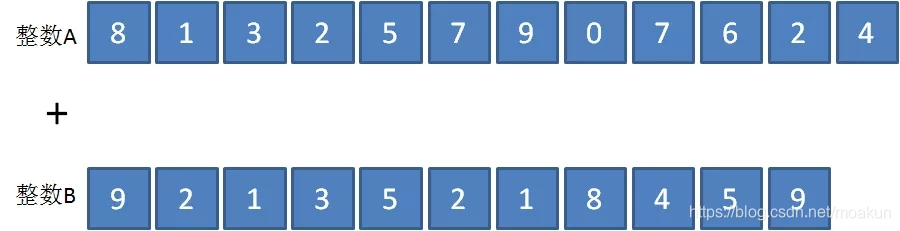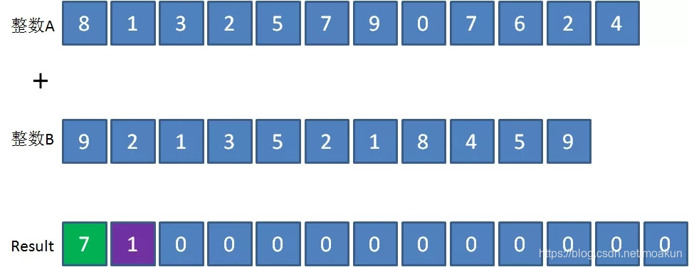int类型的取值范围是 -2147483648——2147483647,最多有10位整数。为了防止溢出,我们可以把大整数的每9位作为数组的一个元素,进行加法运算。(这里也可以使用long类型来拆分,按照int范围拆分仅仅是提供一个思路)