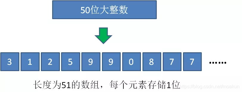 我们之前是把大整数按照每一个十进制数位来拆分,比如较大整数的长度有50位,那么我们需要创建一个51位的数组,数组的每个元素存储其中一位。