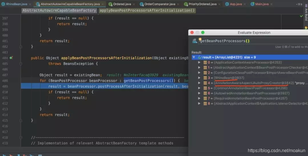 终于找到了问题的所在,那么改如何解决呢? 无法修改Spring AOP的逻辑,但是可以控制Rhino的逻辑,只需要把Rhino的Processor移到Spring AOP的Processor之后,这样就可以在Rhino的Proccessor中处理经过Spring AOP的代理过的beanClass对象了,有效的避免这个问题。