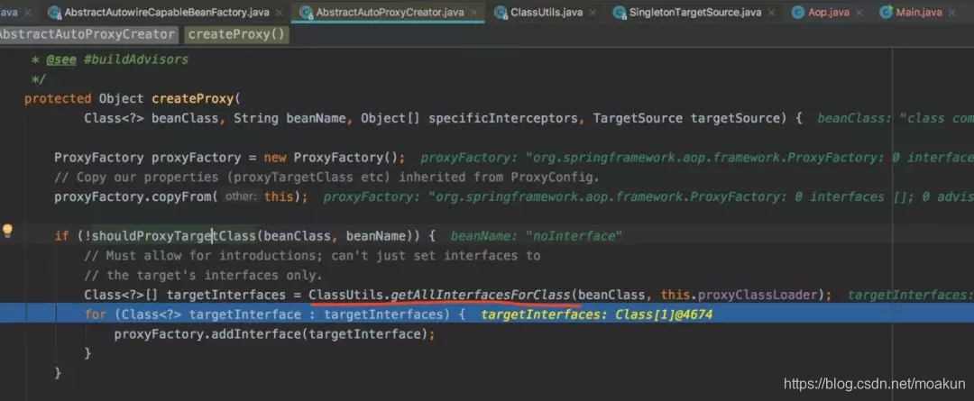 在createProxy方法中,会根据传入的beanClass,即上一个Processor处理过的对象,判断是否有实现接口。