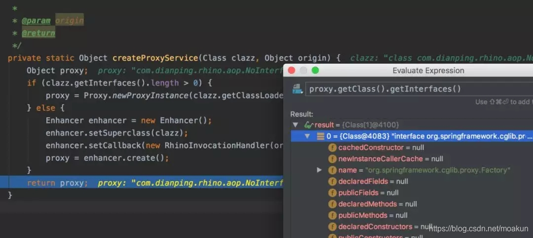 通过Debug发现,Rhino的代理对象Processor排在Spring AOP的Processor,意味着Rhino生成的代理对象,会传给Spring AOP的Processor再做一层代理,在Spring AOP生成代理对象的内部逻辑中,有这么一段判断逻辑。