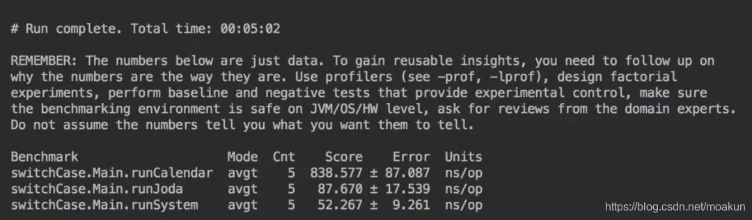 public class Main {static int millis = 24 * 3600 * 1000;public static void main(String[] args) throws Exception {Options options = new OptionsBuilder().include(Main.class.getName()).forks(1).build();new Runner(options).run();}@Benchmark@Threads(5)public void runCalendar() {Calendar calendar = Calendar.getInstance();}@Benchmark@Threads(5)public void runJoda() {DateTime dateTime = new DateTime();}//@Benchmark@Threads(5)public void runSystem() {long result = System.currentTimeMillis() / millis;}}