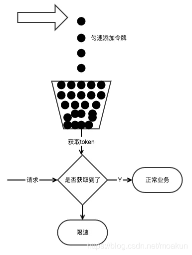 思路:匀速的产生令牌,往桶里面丢,每次请求来,看是否有多余的令牌。如果有获取令牌执行正常业务,偌没有限速。