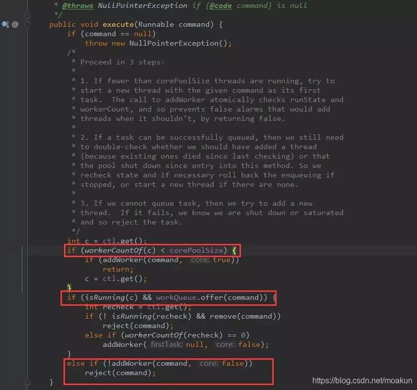 第一个红框:workerCountOf方法根据ctl的低29位,得到线程池的当前线程数,如果线程数小于corePoolSize,则执行addWorker方法创建新的线程执行任务;