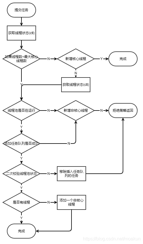 第二个红框:判断线程池是否在运行,如果在,任务队列是否允许插入,插入成功再次验证线程池是否运行,如果不在运行,移除插入的任务,然后抛出拒绝策略。如果在运行,没有线程了,就启用一个线程。