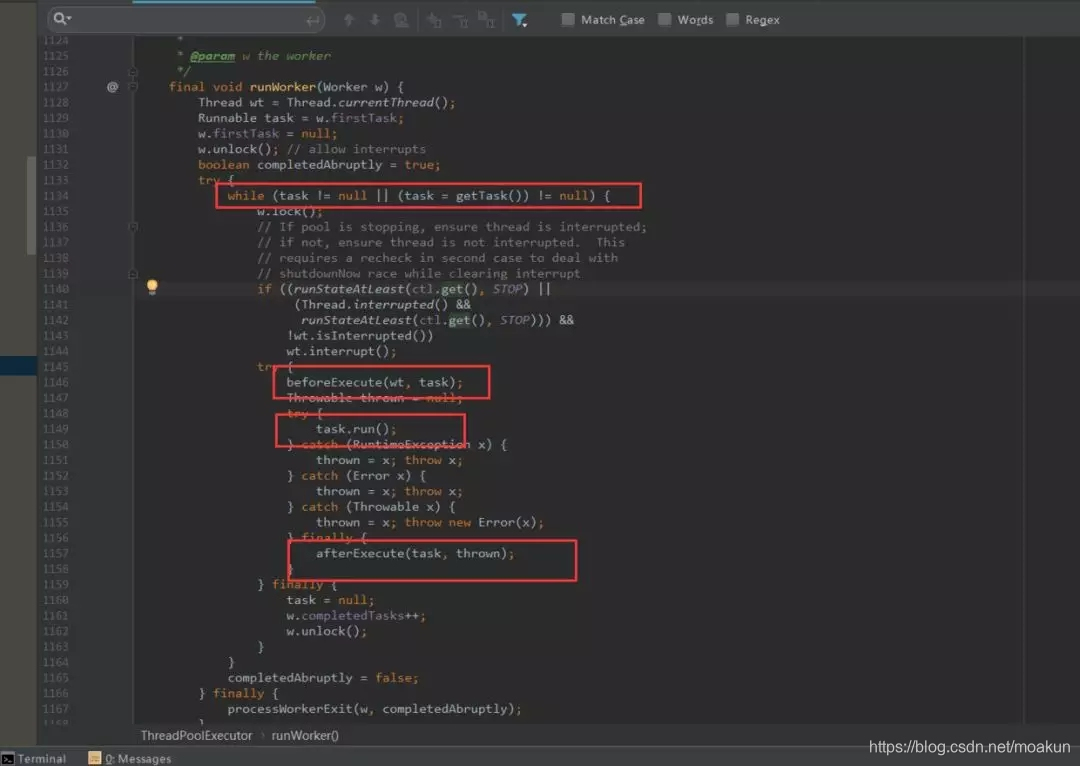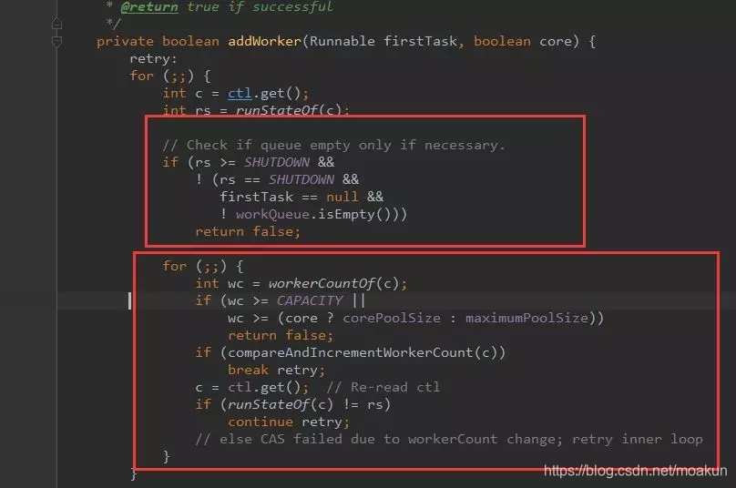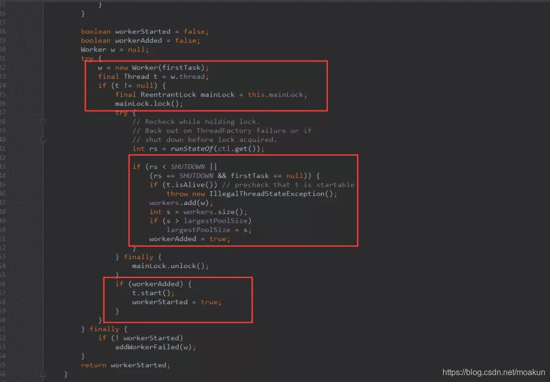 从方法execute的实现可以看出:addWorker主要负责创建新的线程并执行任务,代码如下(这里代码有点长,没关系,也是分块的,总共有5个关键的代码块):
