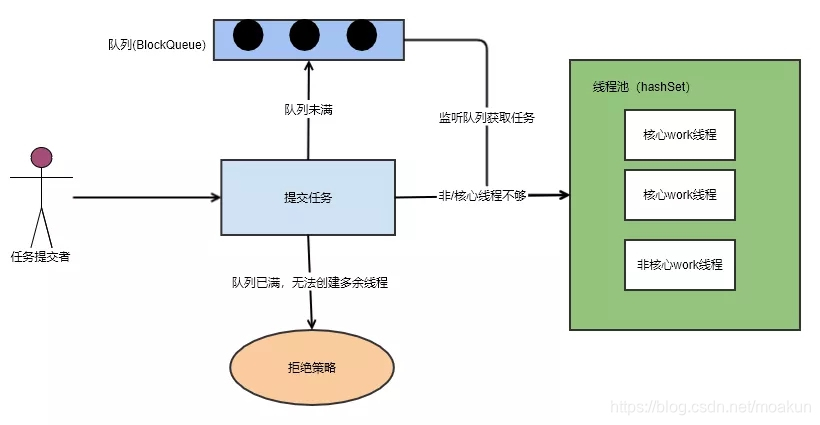 所谓线程池本质是一个hashSet。多余的任务会放在阻塞队列中。