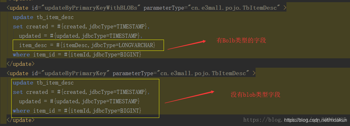 转载自 mybatis更新Blob类型字段要用updateByPrimaryKeyWithBLOBs