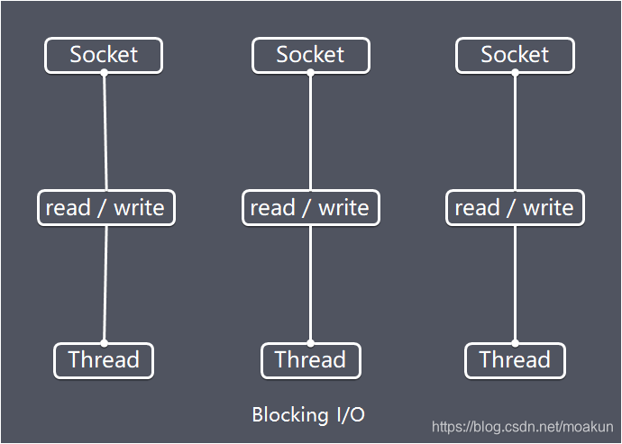 连接建立后,如果当前线程暂时没有数据可读,则线程就阻塞在read操作上,造成线程资源浪费
