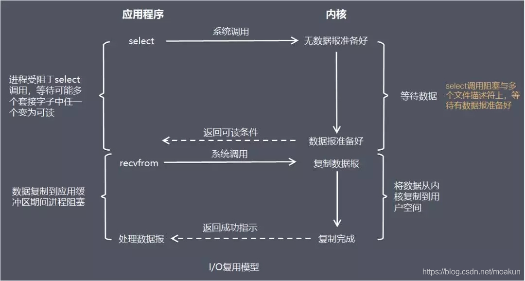 在I/O复用模型中,会用到select,这个函数也会使进程阻塞,但是和阻塞I/O所不同的的,这两个函数可以同时阻塞多个I/O操作,而且可以同时对多个读操作,多个写操作的I/O函数进行检测,直到有数据可读或可写时,才真正调用I/O操作函数