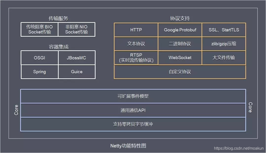 可扩展事件模型、通用通信API、支持零拷贝的ByteBuf缓冲对象