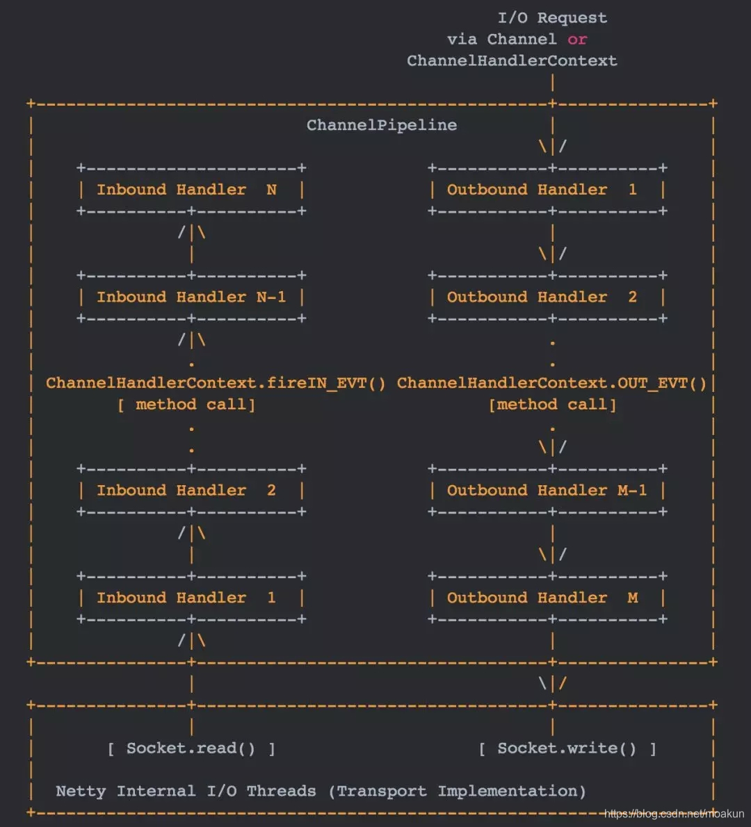出站事件由上下方向处理,如图右侧所示。 出站Handler处理程序通常会生成或转换出站传输,例如write请求。 I/O线程通常执行实际的输出操作,例如SocketChannel.write(ByteBuffer)。