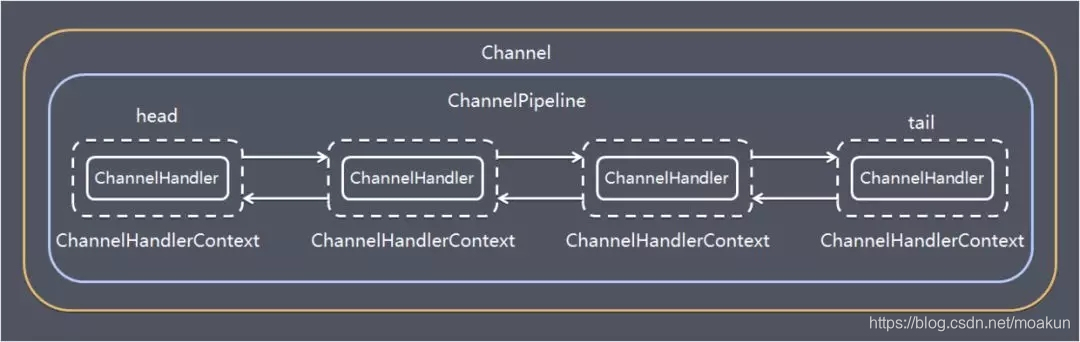 一个 Channel 包含了一个 ChannelPipeline, 而 ChannelPipeline 中又维护了一个由 ChannelHandlerContext 组成的双向链表, 并且每个 ChannelHandlerContext 中又关联着一个 ChannelHandler。入站事件和出站事件在一个双向链表中,入站事件会从链表head往后传递到最后一个入站的handler,出站事件会从链表tail往前传递到最前一个出站的handler,两种类型的handler互不干扰。