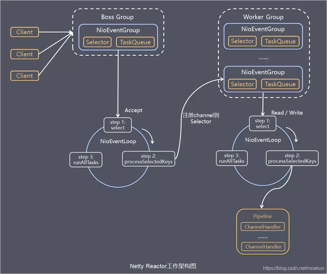 server端包含1个Boss NioEventLoopGroup和1个Worker NioEventLoopGroup,NioEventLoopGroup相当于1个事件循环组,这个组里包含多个事件循环NioEventLoop,每个NioEventLoop包含1个selector和1个事件循环线程。