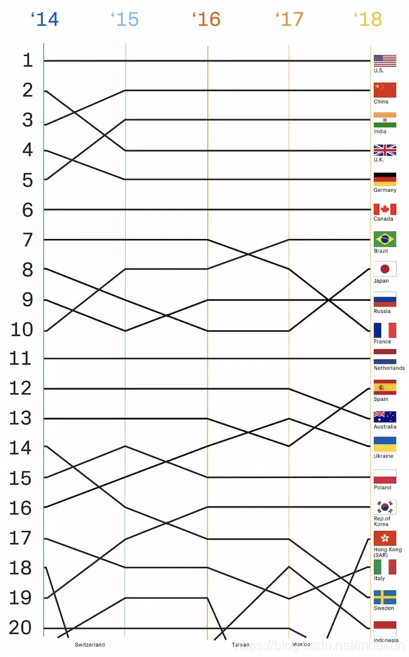 根据2014年至2018年每个国家的独立Contributor数量排名。GitHub广泛地将Contributor定义为对GitHub采取实质性行动(例如,推送代码、打开问题或合并pull请求)的用户,该用户在公共或私有存储库中向平台添加新内容。