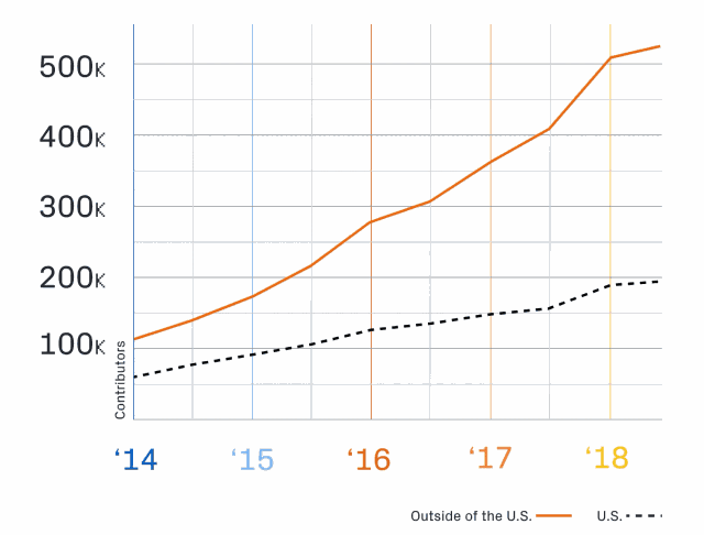 从2014年到2018年,我们可以看到越来越多的开源软件是由美国以外的国家和地区提交的。并且这样的趋势越发明显。