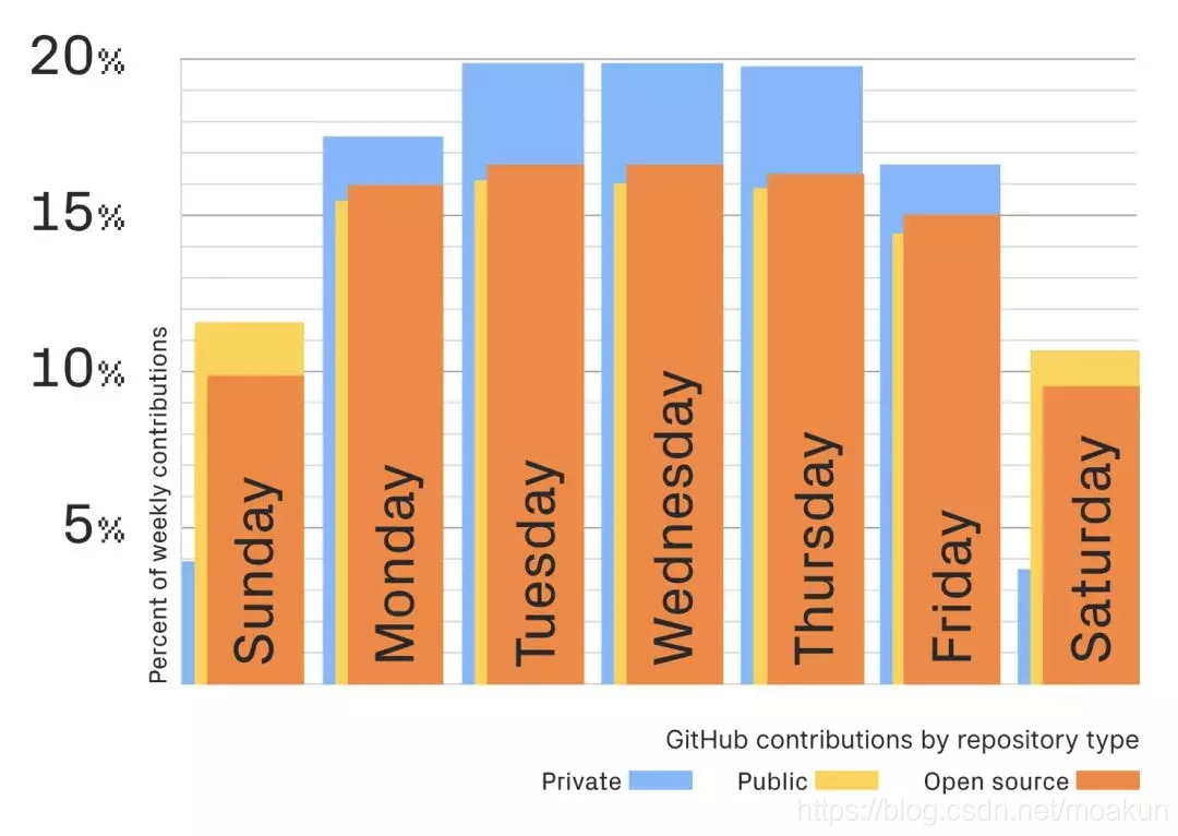 可以看到下午到晚间是用户对私有、公共和开源贡献高峰时间段。